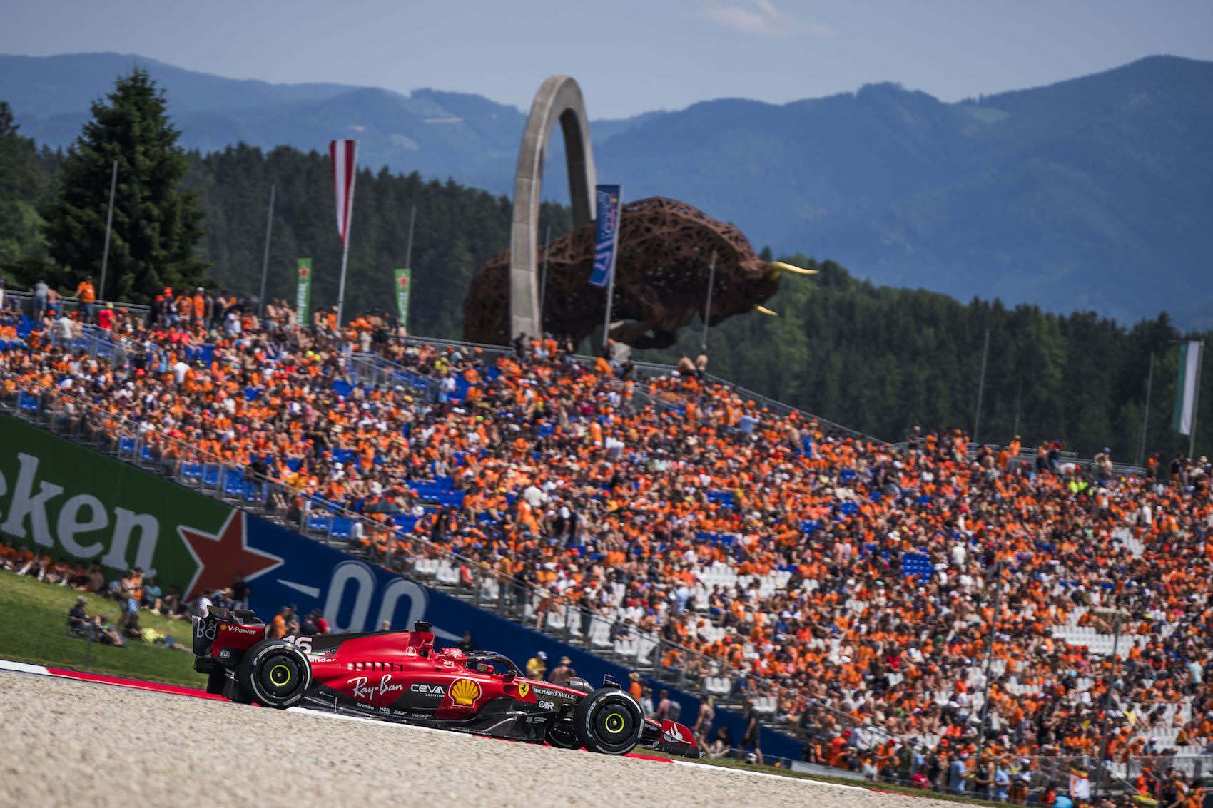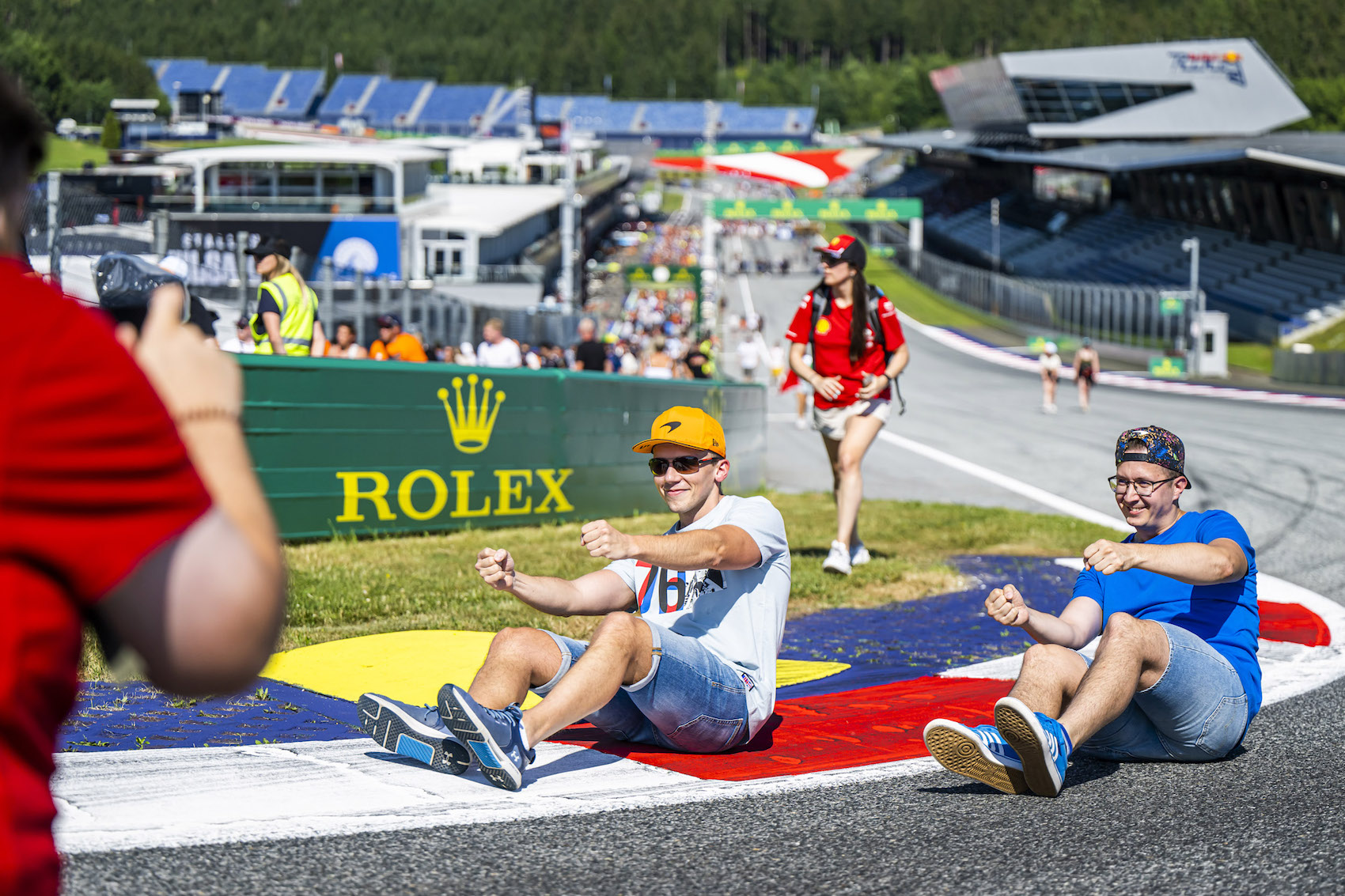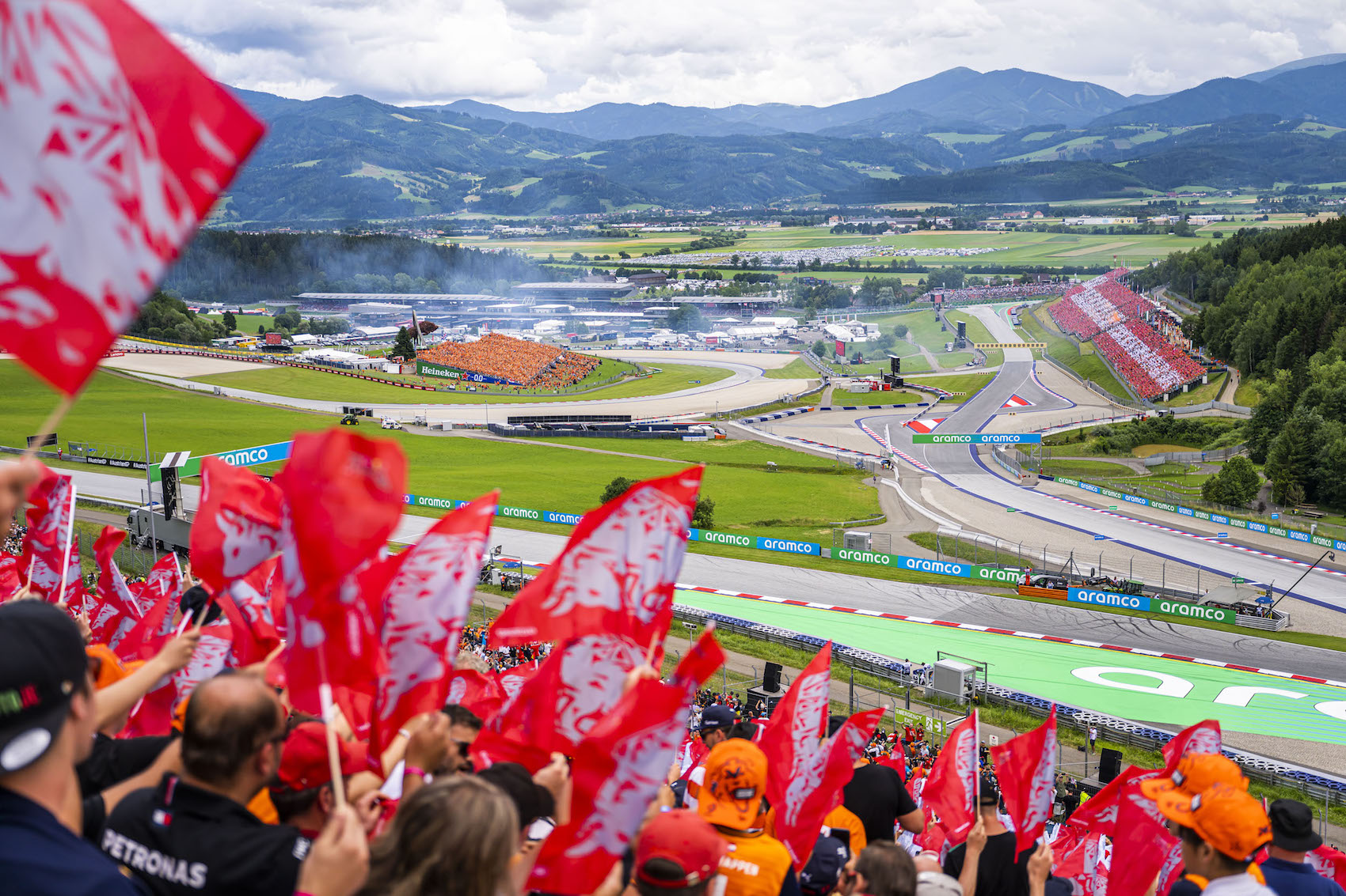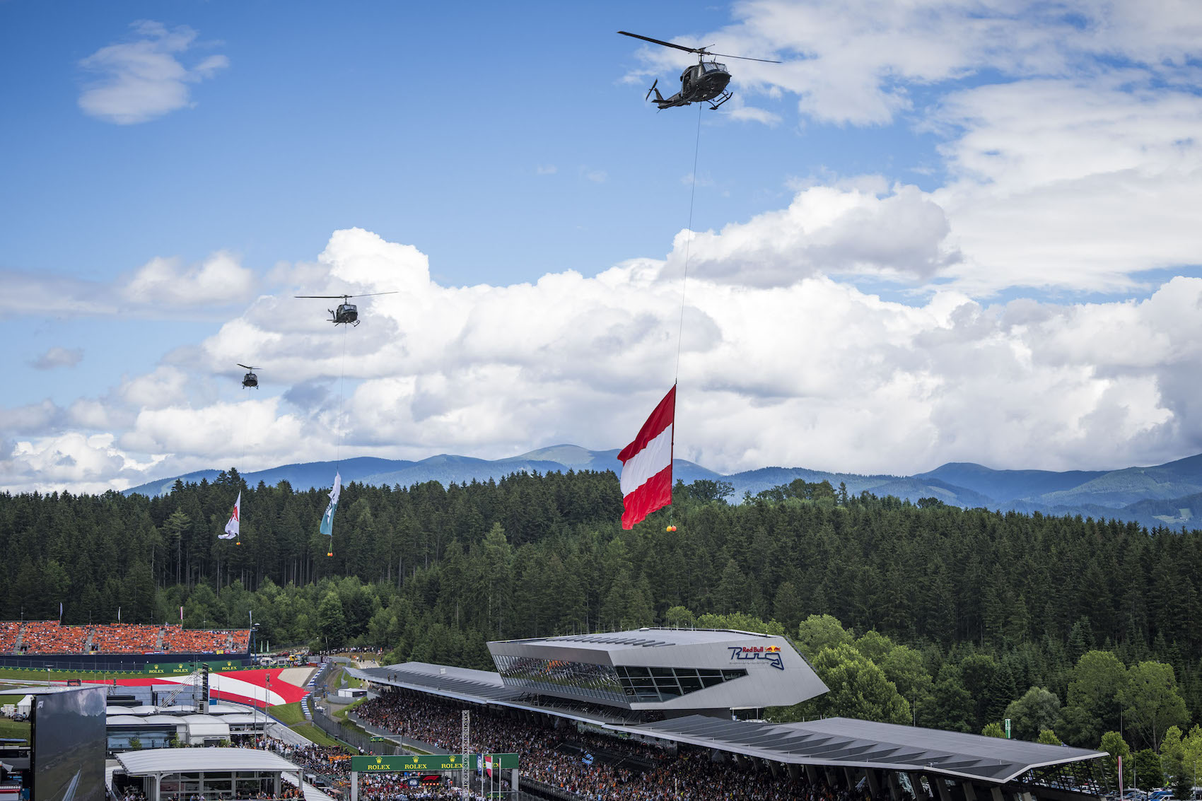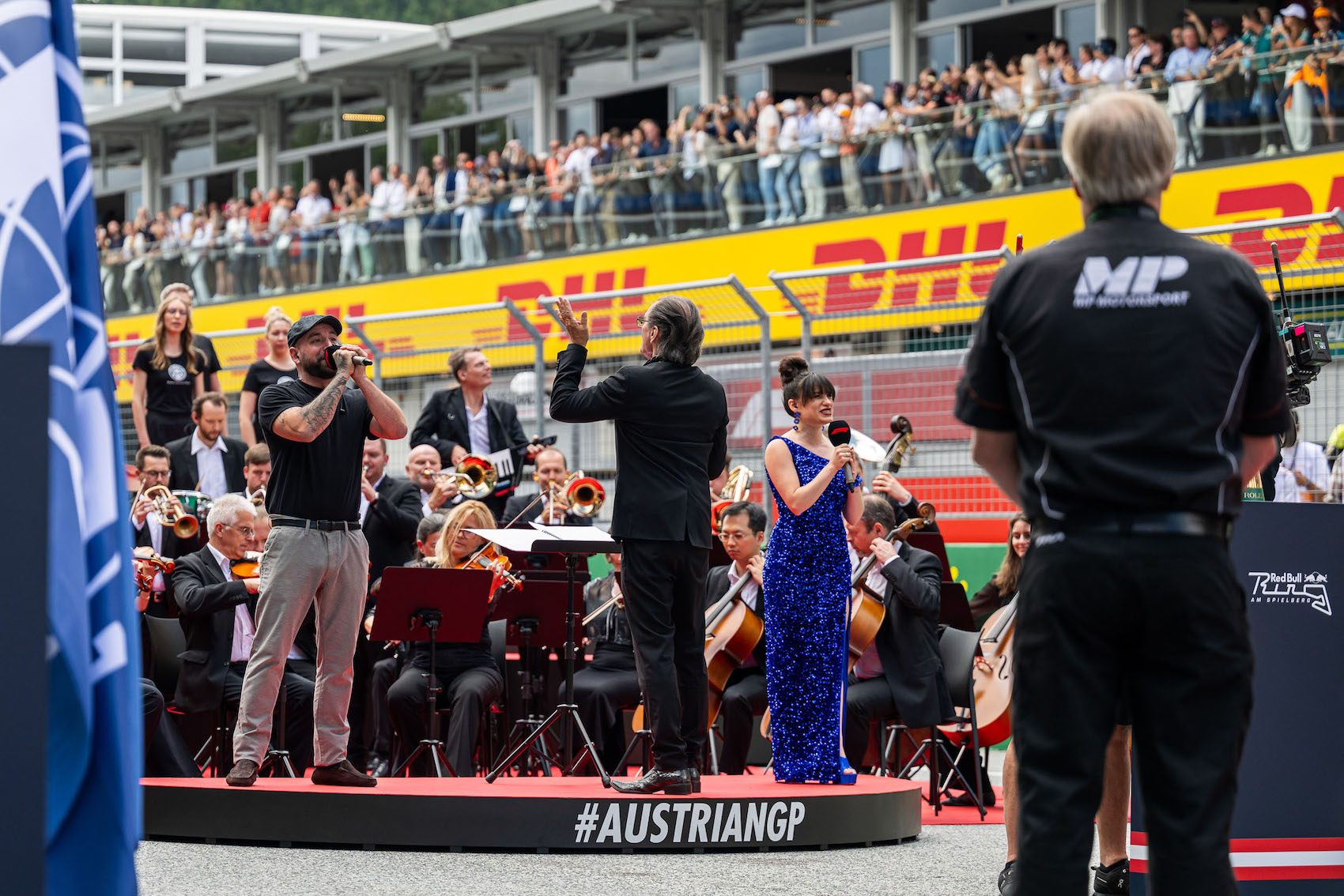 Traditionell beim „Styrian Green Carpet“ wärmten sich die Fans vor dem Welcome Center des Red Bull Ring auf für den GP-Sonntag auf. Gemeinsame Fotos mit Stars der Formel 1 und Autogramme waren heiß begehrt, viele Wünsche wurden erfüllt und Träume wurden wahr! Als Stammgäste des „Holiday Grand Prix“ durften natürlich die Flying Bulls nicht fehlen, die wieder ein beeindruckendes Air Display in den steirischen Himmel zauberten. Während die österreichische Nationalflagge und die steirische Landesfahne über der rot-weiß-roten F1-Arena einschwebten, wurden die Zuschauer Augen- und Ohrenzeugen einer Gänsehaut-Inszenierung, die ihresgleichen sucht. Direkt auf der Start-Ziel-Geraden verschmolzen das „Dachsteinlied“ und „Land der Berge“ bei einer Premiere zum unvergleichlichen Klangerlebnis. Mastermind hinter der Neukomposition im Stil von Red Bull Symphonic ist Christian Kolonovits. Die Stimmen von Christopher Seiler, Juliette Khalil und zehntausender Fans wurden getragen von einem instrumentalen Ereignis der Grazer Philharmoniker und des Kammerchors des Johann-Joseph-Fux Konservatoriums Graz.
